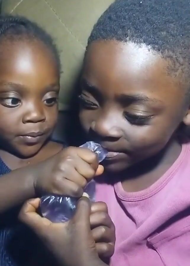 Two young, dark-skinned children are closely seated next to each other. The child on the left, a girl with dark hair in braids, wears a blue dress. The child on the right, a boy with short, dark hair, wears a pink shirt. Together, they hold a small, clear plastic bag filled with a light purple liquid. The boy is pursing his lips and appears to be drinking from the bag. The girl watches him intently. The background is a light tan couch. The camera is close-up and slightly shaky, focusing on the faces of the children and the bag they are sharing.