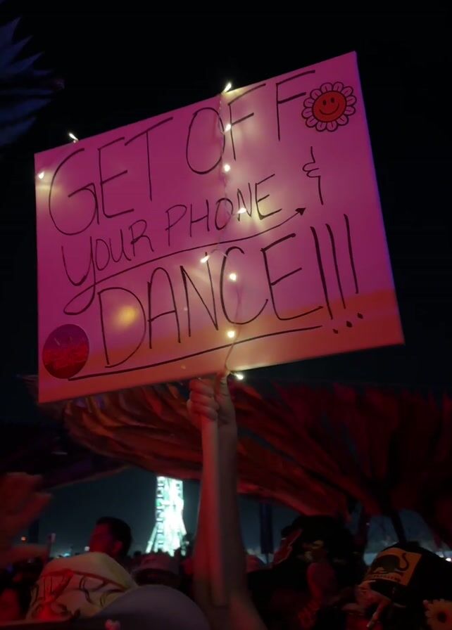 A person is holding a sign in the air at a crowded outdoor event at night. The sign is white with the words "GET OFF YOUR PHONE & DANCE!!!" written in black marker. There's a small sunflower drawing with a smiley face next to the word "OFF". Small lights are taped around the edge of the sign, illuminating it. The scene has a reddish hue, likely from the event lighting. In the background, there are other people, a large Ferris wheel, and what appears to be a stage or structure with lights. The camera moves slightly, causing the image to shift.