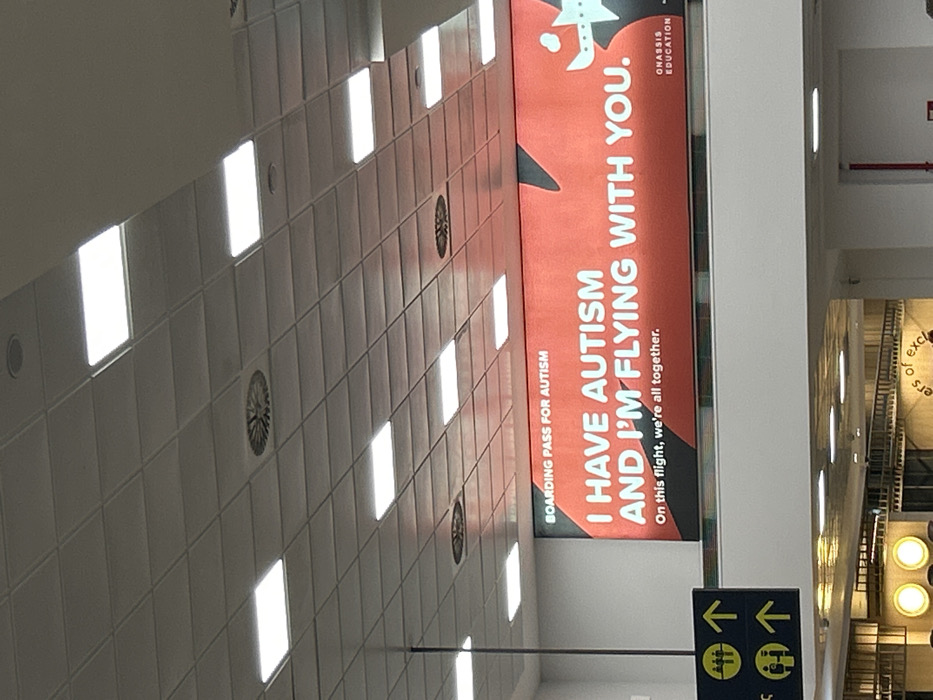This image displays the interior of Corfu International Airport "Ioannis Kapodistrias" (CFU) in Corfu, Greece. A large, prominent digital billboard is centered, featuring a red background with white text. The primary message reads: "BOARDING PASS FOR AUTISM", "I HAVE AUTISM AND I'M FLYING WITH YOU.", and "On this flight, we're all together." The lower right corner of the billboard includes the "ONASSIS EDUCATION" logo and a white pictogram of an airplane with a small human figure inside. Above the billboard, a white grid ceiling is visible, fitted with numerous rectangular LED light panels and several circular air diffusers. To the left of the billboard, a black and yellow directional sign is mounted, displaying two upward-pointing arrows alongside white pictograms depicting groups of people (three people and two people). A dark, vertical structural column is partially visible along the far left edge of the frame. The lower portion of the image shows the upper section of a lower level of the airport terminal, with indistinct architectural details and partial text from another distant sign. No identifiable individuals or specific actions are discernible.