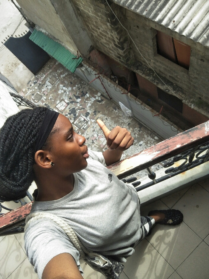 A young dark-skinned female is depicted on a tiled balcony in Cotonou, Benin