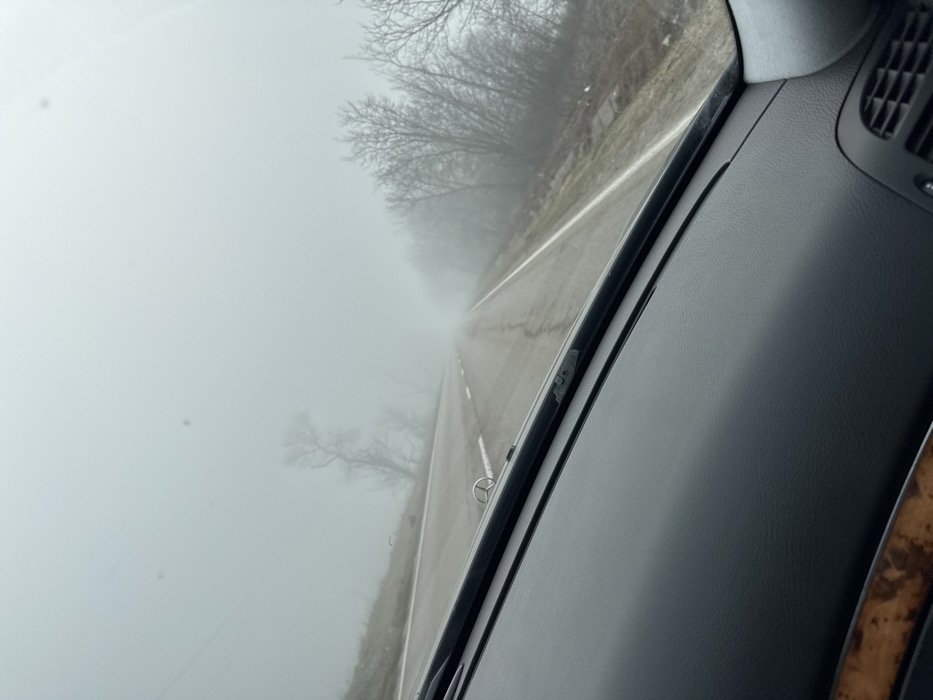 The image depicts a foggy road scene in Kovachevets, Bulgaria, viewed from the interior of a moving vehicle. The foreground is occupied by a dark grey, textured dashboard, with a Mercedes-Benz emblem visible on the hood just beyond the windshield base. A strip of wood grain trim is present along the lower left interior. The asphalt road, marked with a solid white line on the right shoulder and a broken or solid white center line, extends into the distance. Bare, deciduous trees line both sides of the road, appearing indistinct due to heavy, uniform fog that severely limits visibility to approximately 50-75 meters. The terrain adjacent to the road consists of dry grass and sparse vegetation. No people or animals are visible. The sky is completely obscured by the fog.