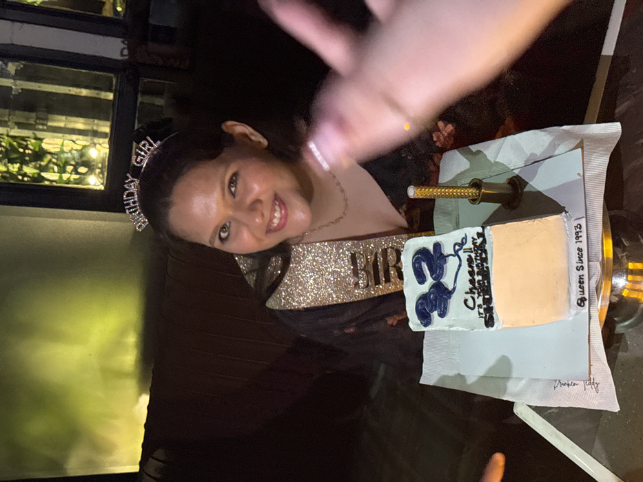 A woman with a "Birthday Girl" headband smiles at the camera. She wears a sparkly "Birthday" sash. In front of her is a slice of birthday cake with blue frosting that reads "22. Cheers!! It's your birthday." A golden candle holder is in the cake. The cake sits on a white napkin with "Queen Since 1993" printed on it. A hand appears blurred in the upper right corner.