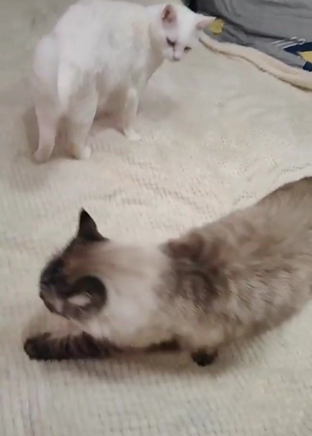two cats on a bed. One is a white cat that is standing still, and the other is a Siamese cat that is on its side. The Siamese cat is moving its paws as if it is playing. The bed has a light-colored, textured blanket on it, and there are two pillows with geometric patterns on the headboard.