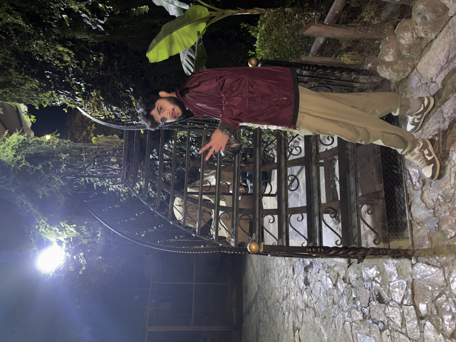 The image depicts a nighttime outdoor scene in Barza Municipality, Syria. A male individual with dark hair, a beard, and a mustache stands in the lower right foreground, looking directly at the camera. He wears a maroon jacket over a lighter shirt, light olive green cargo pants, and two-toned high-top sneakers. His left hand is raised, forming a 'V' gesture, with a watch visible on his wrist. To his left, a dark metal spiral staircase with ornate scrollwork railings ascends into the upper background. The ground is paved with wet-appearing irregular flagstones. Dense green foliage, including vines and a large banana plant leaf, frames the scene, particularly on the right and covering vertical surfaces. A bright artificial light source illuminates the upper left, while a dark, grid-like fence is faintly discernible in the left background.
