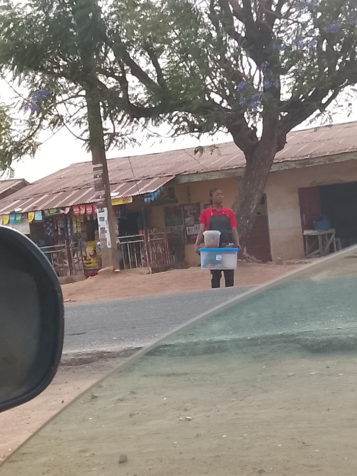The image displays a street scene in Jos, Nigeria, observed from the interior of a vehicle, indicated by a partial view of a car's side mirror on the left and a reflective window surface on the right. A woman stands on a dirt shoulder adjacent to a paved road. She wears a red short-sleeved top and a dark apron, holding two plastic food containers stacked vertically; a larger, clear rectangular container with a blue lid is at the bottom, topped by a smaller, clear cylindrical container with a light-colored lid. Behind the woman, a large tree with green foliage and scattered purple blossoms stands prominently. To the left of the tree is a utility pole. In the background, a row of single-story buildings with corrugated metal roofs is visible. The building directly behind the woman appears to be a small shop with items displayed behind a metal barrier.