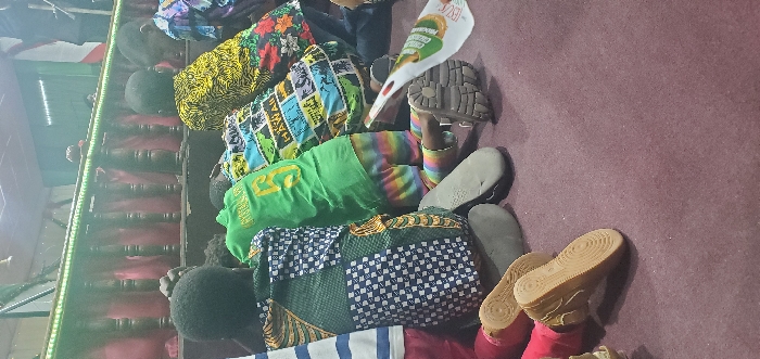 A group of people are lying on their stomachs, seemingly in a row. They wear vibrant and patterned clothing. Several pairs of shoes are scattered on the ground next to them. The scene appears to be indoors with a reddish-brown carpet and what looks like a stage or platform with decorative lighting.