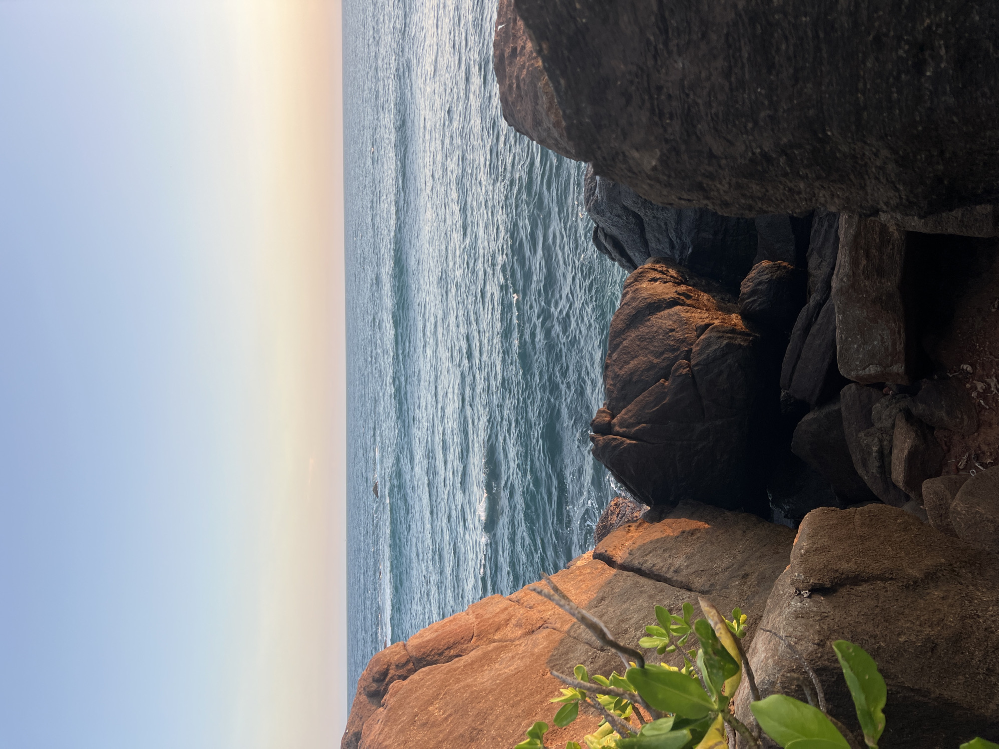 The image displays a coastal landscape in Goviyapana, Sri Lanka. The scene is dominated by large, weathered rock formations. On the left, a prominent, reddish-brown rock face is illuminated by warm, low-angle light, suggesting late afternoon or early morning. Sparse green foliage with multiple small leaves extends into the lower-left foreground from a branch. On the right, dark, shadowed rocks frame the view. Between these formations, the open ocean occupies the midground, characterized by blue-green water with visible waves and ripples, some cresting with white foam. A small, dark, indistinct object is discernible on the distant horizon line. The sky above is a clear gradient, transitioning from a light blue at the top to a pale orange-yellow hue near the horizon. No individuals or specific actions are visible within the frame.
