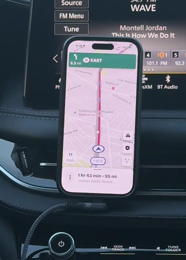 interior of a car, focusing on the dashboard. A smartphone mounted in the center console displays Google Maps navigation, guiding the driver to Indian Wells Tennis, 95 miles away via I-10 East. The car's infotainment system displays the radio station and current song. The car is moving, as indicated by the speedometer on the phone showing increasing speeds of 10, 11, 12, and 13 mph. A person is heard speaking, laughing, and saying "Okay."