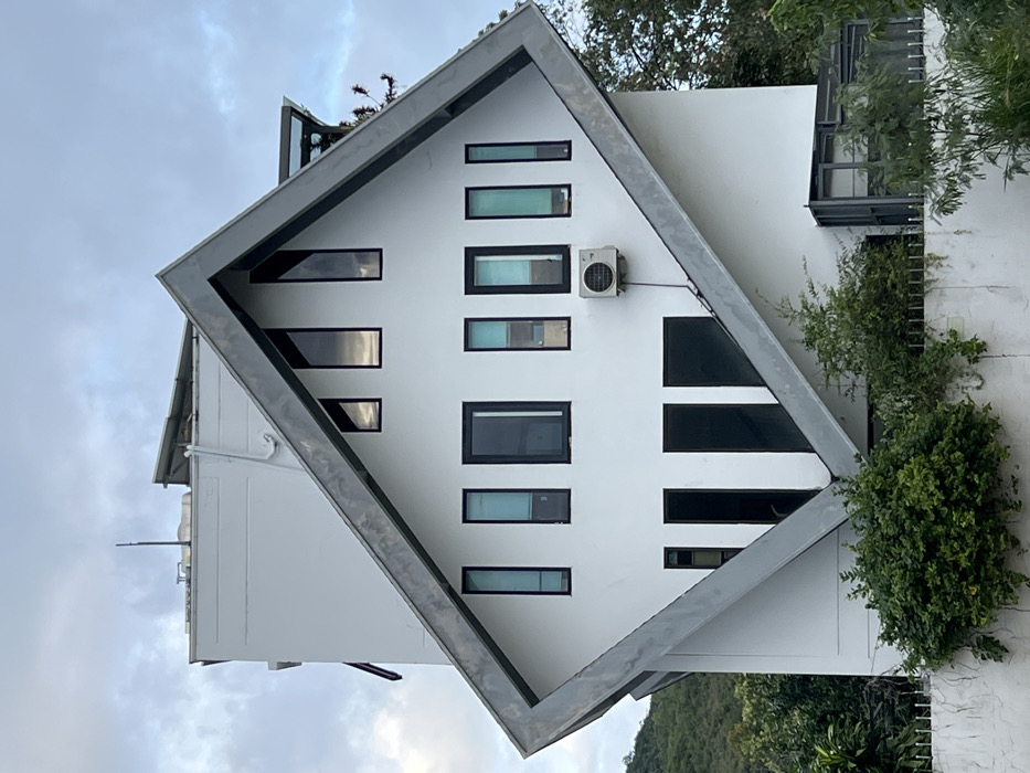 An architectural photograph taken in Nha Trang, Vietnam, depicts the facade of a multi-story, modern residential or commercial building under a cloudy sky. The building is predominantly white with a distinct, large, dark gray angular frame that outlines a central section, appearing as a tilted parallelogram or a stylized 'A' frame. The facade features multiple rectangular windows with dark frames. On the uppermost visible level, three narrow, tall windows are present, with reflections of the sky visible within them. Below this, a row of five windows of varying widths is observed, also with dark frames and some displaying sky reflections. An outdoor air conditioning unit with a circular fan grill is mounted on the white wall below the second-row windows, slightly right of center, with a visible conduit extending downwards. The lowest visible section of the building within the angular frame shows three dark, tall, narrow window or door openings. The building's flat roofline is visible above the angular frame on the left, equipped with what appear to be solar panels or water heating units and a vertical antenna or vent. Green, dense foliage and trees are visible around the base of the structure, partially obscuring a white, textured perimeter wall topped with metal spikes. A verdant, tree-covered hill or mountain range is present in the background on the left. No individuals or direct human activity are depicted.