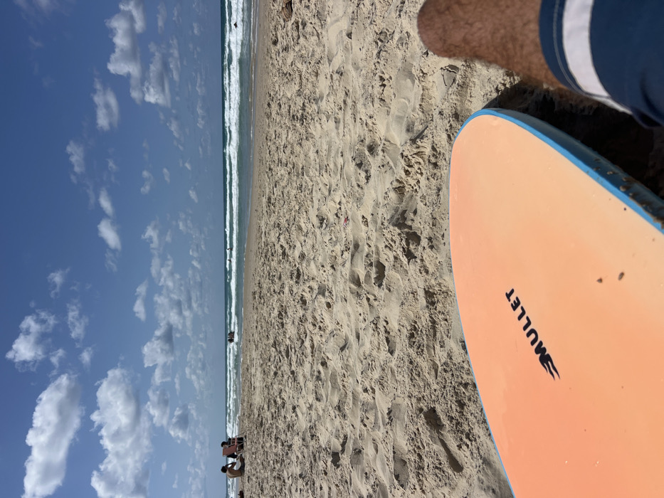 The image depicts a beach scene at Beit Yanai, Israel, viewed from a low perspective on the sand. In the immediate foreground, the right leg of an individual, covered in brown hair and wearing blue swim trunks with a white stripe, is visible alongside an orange surfboard. The surfboard, positioned diagonally, features the black text "MULLET" with a flame graphic and has a blue rail. The sand in the foreground and midground is light brown, showing various textures and indentations. In the midground, a sandy beach extends towards the water. To the far left, two individuals are seated on what appear to be beach chairs. Closer to the waterline, several people are partially submerged in the turquoise-blue Mediterranean Sea, which exhibits moderate waves with white crests. The background consists of a clear blue sky dotted with scattered white cumulus clouds. The lighting suggests a bright, sunny day.
