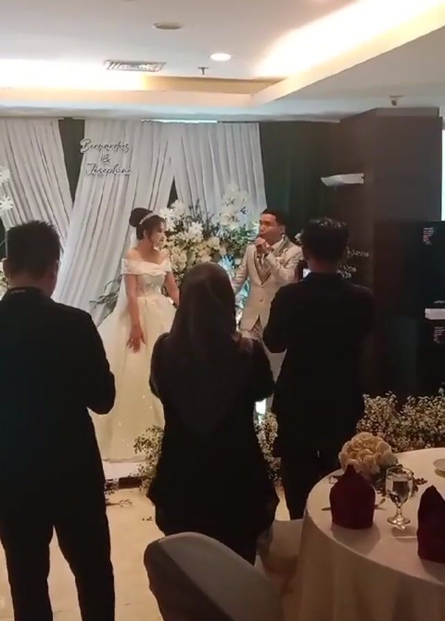 A wedding reception is in progress. A bride in a white gown and a groom in a light suit stand on a stage in front of a white curtain backdrop adorned with floral arrangements. A man with a microphone, presumably the groom, is singing. Three individuals, two men in black suits and a woman in a black hijab, stand in front of the stage taking pictures or videos with their phones. A round table with white tablecloths and red napkins sits to the right of the stage. The room is well lit.