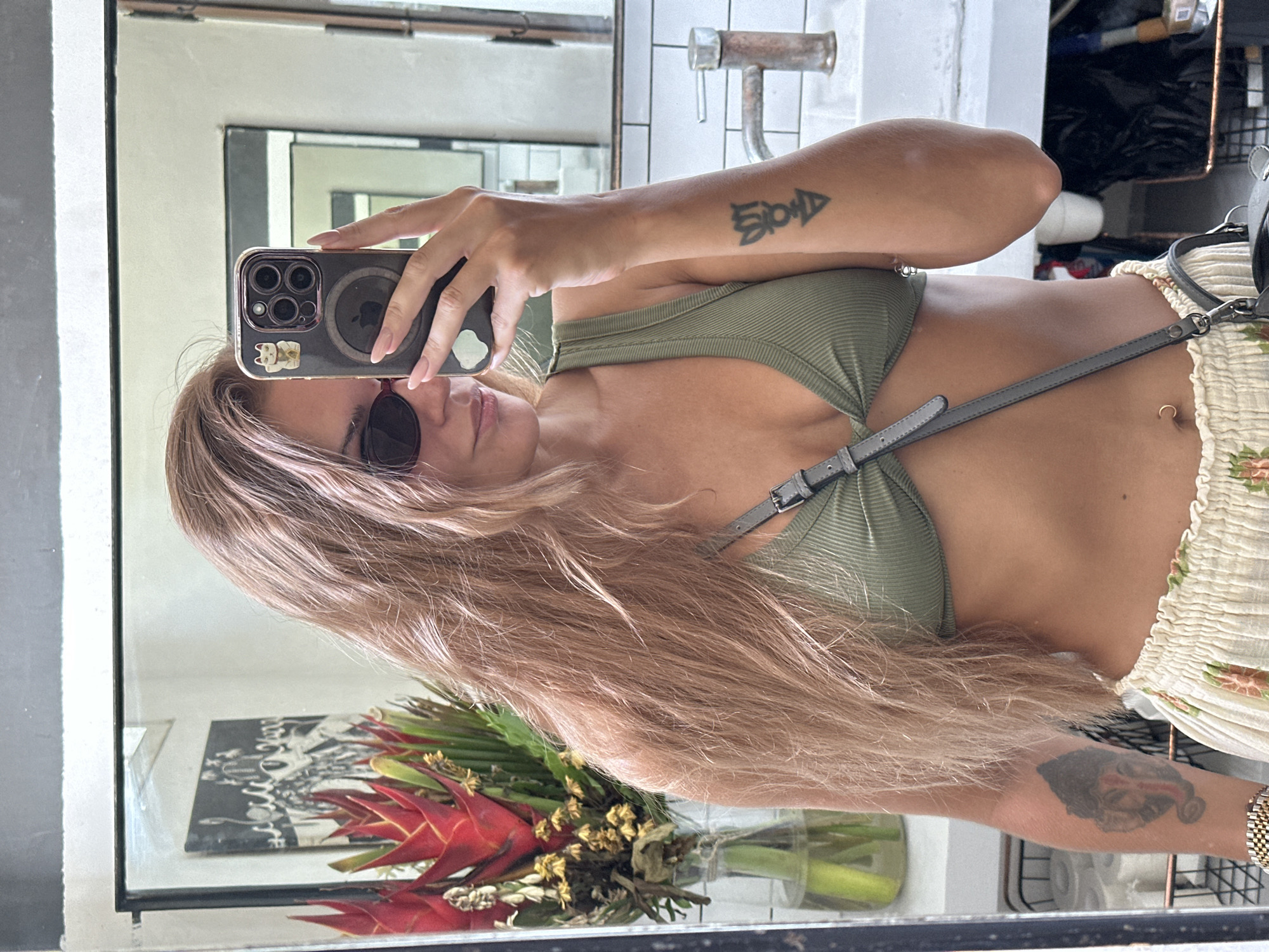 A female individual is depicted taking a mirror selfie indoors in Ungasan, Indonesia. The subject, with long, light brown hair, wears dark sunglasses with reddish frames, an olive-green ribbed crop top, and a light-colored pleated skirt with a floral pattern. She has a dark grey cross-body bag, a gold-toned watch on her left wrist, and a small gold belly button ring. Tattoos are visible: a stylized design on her right forearm and a Ganesha head on her left upper arm. She holds a dark-colored smartphone, equipped with a clear case featuring a MagSafe ring and a Maneki-neko sticker, to capture her reflection. Her fingernails are manicured with light pink polish. The reflected background reveals a bathroom or vanity area. To the left of the subject, a vase containing red tropical flowers and dried yellow foliage stands before a framed black and white artwork. To the right, a white tiled wall is visible above a white sink fitted with a rustic-style metallic faucet. Below the sink, a wire basket holds rolls of toilet paper, and other dark objects and a white cup are present. The mirror itself has a black frame.