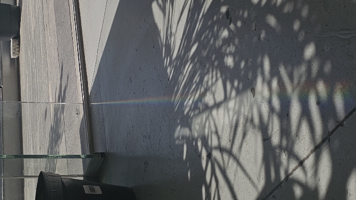 A bright rainbow spans across a concrete wall, illuminated by sunlight filtering through tree leaves. Shadow patterns from the foliage dance on the wall's surface. A glass structure with a black pipe at the base is visible on the left. The wall's texture is coarse, with visible pores and cracks, contrasting with the clean lines of the glass and pipe.