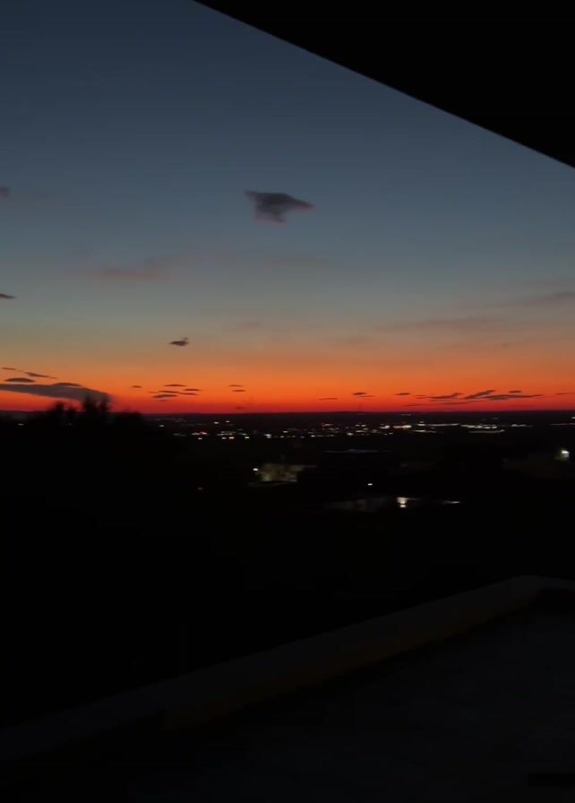 The camera pans across a sunset vista of a city from an elevated position, possibly a balcony. The sky transitions from a dark blue at the top to a vibrant orange near the horizon. There are a few sparse clouds. The city lights are visible as small points scattered across the dark landscape. The foreground is mostly obscured, but appears to be part of the balcony or building structure.