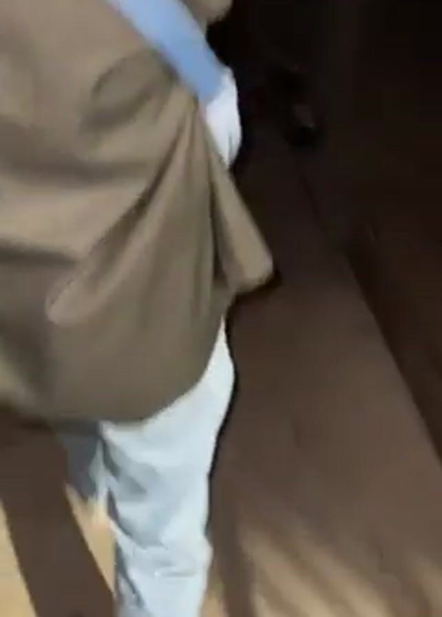 A video taken from behind follows three individuals walking on a sidewalk, likely at night. The person closest to the camera wears light blue jeans and white shoes, with a dark green or black jacket and a white shoulder bag. A person walks to their left, wearing a tan jacket and a white shoulder bag. Another person is walking to the far left, dressed in a dark, puffy jacket. The sidewalk is grey, and a dark fence with vertical bars is visible along the right side of the frame. The lighting is dim, casting shadows on the sidewalk.