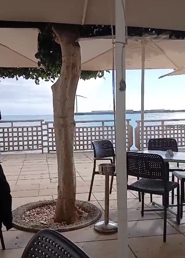 n outdoor seating area of a restaurant or cafe near the ocean. There are several tables and chairs under large white umbrellas, with a tree growing through a circular opening in the patio floor. In the background, the ocean is visible, with a boardwalk-style fence separating the seating area from the water. One person is standing at the fence looking at the water. At one of the tables, three people are seated, appearing to be engaged in a conversation or reading menus. The scene is fairly casual and relaxed, with a focus on the outdoor setting and the ocean view.