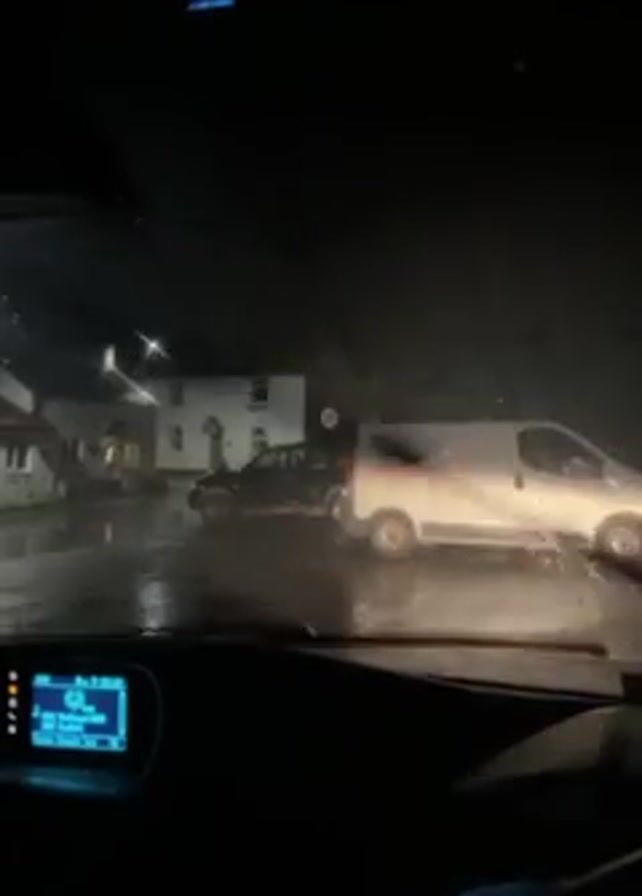 The video is shot from inside a car on a rainy night. Raindrops streak the windshield, obscuring the view somewhat. Outside, there are two vehicles parked on the street, a dark-colored SUV and a silver van. The street is wet and reflects the light from street lamps and the vehicle headlights. In the background, houses are visible, their facades lit by porch lights. The car's dashboard is visible, with the infotainment screen displaying information. The wipers appear to be running. The scene is dark and wet.