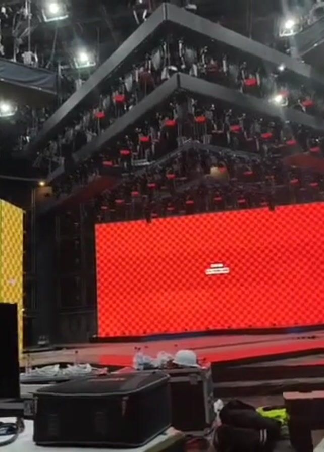 stage setup, possibly for a performance or show. In the center, a large screen displays a red checkerboard pattern. Flanking the screen are structures with green, yellow, and blue checkerboard designs. Overhead, a complex lighting rig hangs from the ceiling. There are also cases of equipment and other stage materials scattered around the stage floor. The room is large and appears to be a theater or auditorium. The shot pans slightly right to show the full scene.