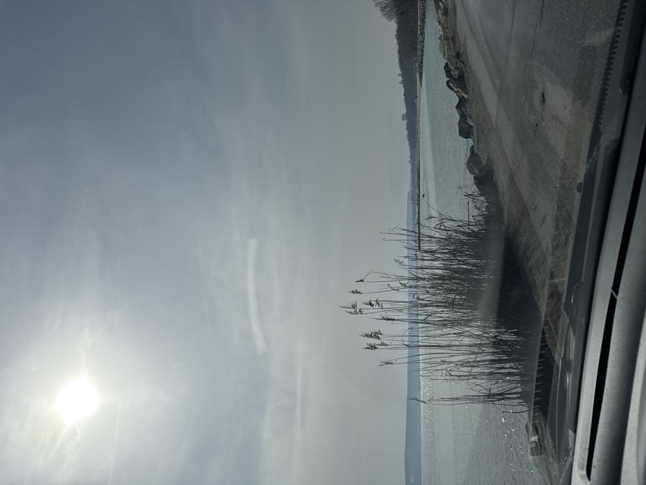 The image depicts a coastal scene in Varna, Bulgaria, captured from inside a vehicle, evidenced by the dashboard and windshield visible at the bottom. The bright sun, obscured by haze, is positioned in the upper left quadrant of a partly cloudy, light blue sky. The prominent feature in the mid-ground is a dense clump of tall, dried reeds or similar grasses, silhouetted against the water. To the left of these reeds, a large body of water, consistent with the Black Sea, stretches horizontally, reflecting sun glints on its rippled surface. A dark, possibly avian, shape is airborne low over the water in the mid-distance. The shoreline to the right of the reeds is rocky, leading to a visible dirt or unpaved road running parallel to the water. Further along the coastline, a long pier or breakwater structure extends into the sea. Beyond this structure, a sandy beach is visible, backed by a treeline of mostly bare deciduous trees. A faint outline of urban structures or buildings can be discerned on the distant shore, beneath the tree line. The overall atmosphere is bright but with a degree of atmospheric haze.