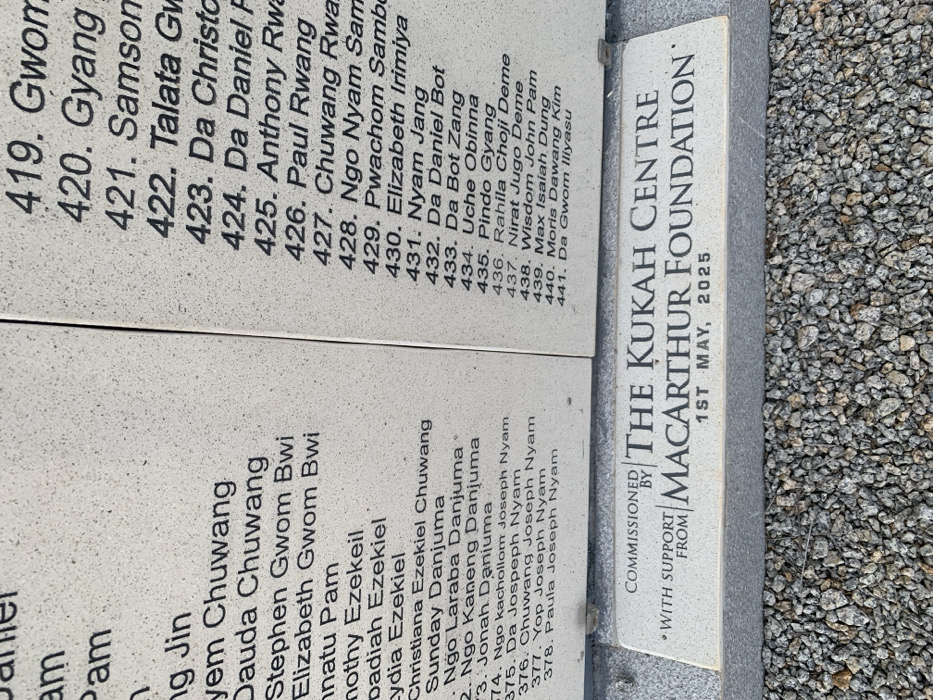 The image displays a close-up view of a stone memorial, situated outdoors in DU, Nigeria. The central focus is on two vertical, light-colored stone panels, a horizontal dedication plaque beneath them, and a bed of grey gravel at the base. The vertical panels are inscribed with multiple lines of black text, predominantly lists of names. The left panel shows partial names such as "Dauda Chuwang", "Stephen Gwom Bwi", "Christiana Ezekiel Chuwang", "Sunday Danjuma", and "Paula Joseph Nyam", with visible numerical identifiers ranging from 373 to 378 at the bottom of the section. The right panel continues this numerical sequence, listing names such as "Gyang", "Talata Gwom", "Anthony Rwang", "Elizabeth Irimiya", "Uche Obinna", "Wisdom John Pam", and "Da Gwom Iliyasu", with numbers clearly visible from 419 to 441. Below these panels, a horizontal stone plaque bears the inscription: "COMMISSIONED BY THE KUKAH CENTRE" and "WITH SUPPORT FROM MACARTHUR FOUNDATION", followed by the date "1ST MAY, 2025". No people are visible in the frame. The overall scene suggests a commemorative structure.