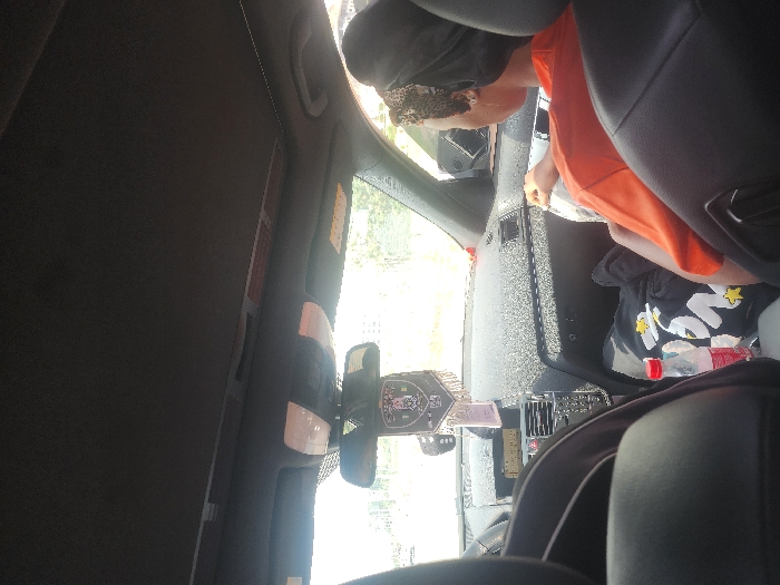 The image displays the interior of a vehicle, captured from a rear passenger perspective looking forward