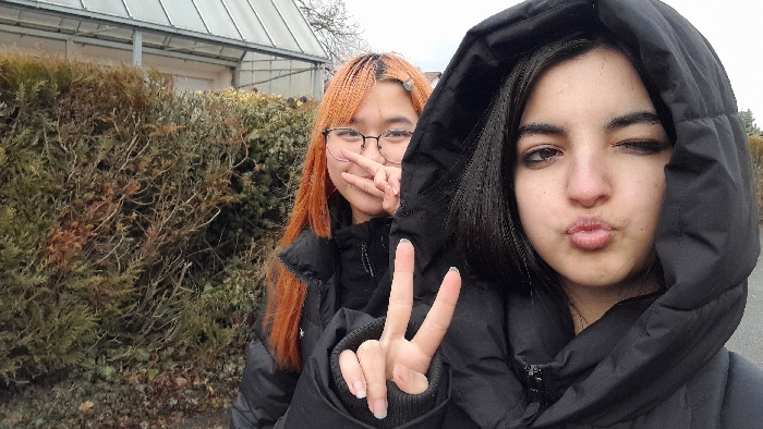 Two females are depicted in a close-up outdoor photograph taken in Meistratzheim, France