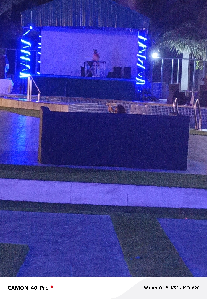 A dimly lit outdoor venue features a stage with blue lighting, a person behind a DJ setup, and blue illuminated pillars. A pool is visible with a dark barrier in the foreground. A person appears to be in the pool. The ground is covered in dark grass and irregularly shaped blue pavement sections. The low lighting and color scheme give the scene a nocturnal ambiance.