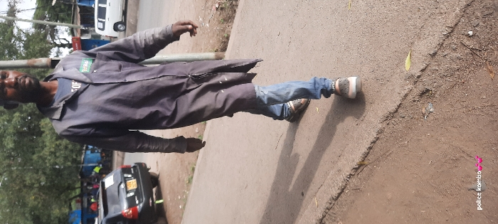 A dark-skinned male subject, estimated to be in his 30s or 40s, with short dark hair and a beard, is depicted walking on a paved sidewalk. He wears a dark grey or blue long-sleeved work coat over a lighter blue t-shirt with partial white text, blue jeans that appear worn or ripped at the knees, and beige and dark brown slip-on clogs. A green rectangular patch, possibly bearing the text "GLOBAL," is affixed to the left chest pocket of his coat. His right hand is visible and appears gloved or discolored. The subject's head is turned slightly towards the camera's perspective. The scene is set on a street in Nairobi, Kenya. In the background, a black Subaru Outback with a visible Kenyan license plate (partial registration "KCY") is parked on the left side of the road, facing away from the camera. Further down the street, a white van or SUV is partially visible. Behind these vehicles, several structures with blue corrugated metal roofs or walls, indicative of roadside stalls or small businesses, are present amidst green foliage and trees. A dark utility pole stands to the right of the walking subject. The foreground consists of an unpaved dirt path transitioning to a concrete or asphalt sidewalk, exhibiting a slight elevation difference and minor ground debris. The lighting suggests daytime conditions.