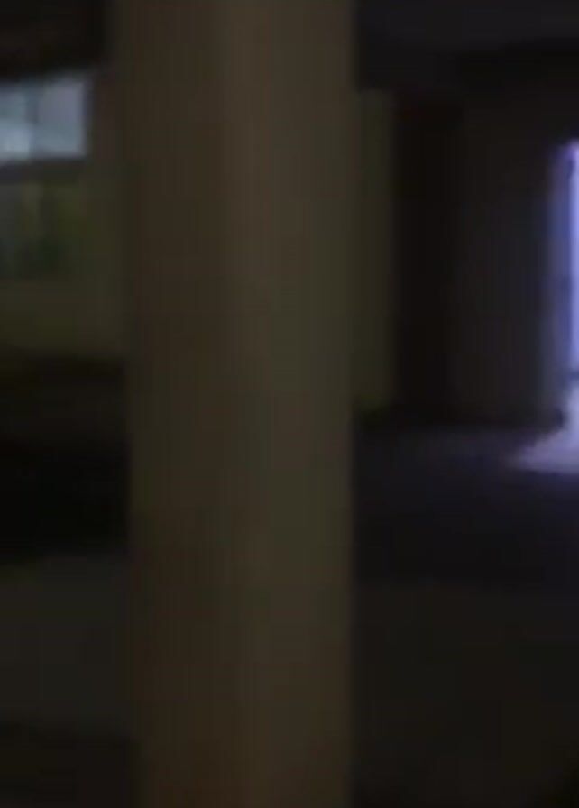first-person perspective moving through a dimly lit outdoor walkway with concrete pillars. The walkway leads to an open doorway that reveals a long, brightly lit indoor hallway with multiple doors on either side. The floor is light-colored, and the walls are a muted yellow. The light source in the hallway appears to be fluorescent. No people or other notable objects are visible. The camera movement is slightly shaky, suggesting it is handheld.