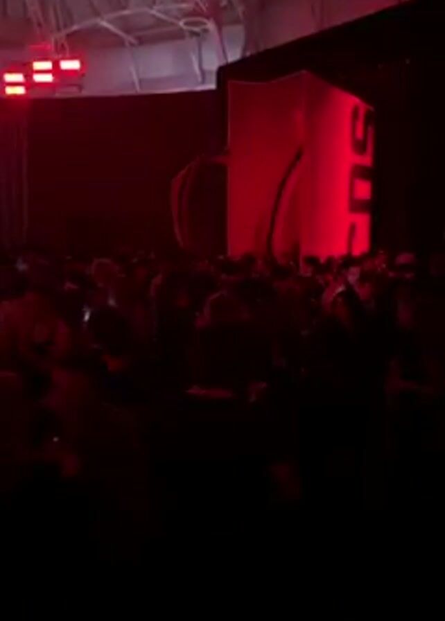 crowd of people in a large, dimly lit room. The room has a high ceiling and a stage with a large, white cube on it, illuminated in red. The letters "SOS" are visible on the cube. The people in the crowd are mostly silhouetted, but some are moving slightly, possibly dancing. There is a sound system playing music.