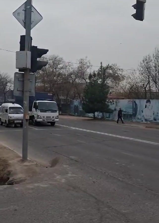 traffic stop in what appears to be a city. The camera pans from a line of cars and a traffic light to the left. The cars include a white van and a small truck. The camera then pans to the right to a crosswalk and a building that says “korzinka.uz.” Several cars are parked in front of the building. A few people are visible near the crosswalk.