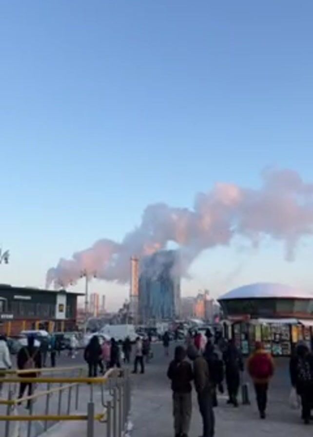 busy street scene in what appears to be a cold, possibly snowy city. People are walking in various directions. A tall, modern building in the background is emitting large plumes of smoke. There is a McDonald's restaurant visible on the left side of the frame, and a small newsstand or kiosk on the right. The sky is a clear blue, and the light suggests it is either early morning or late afternoon. The overall mood seems urban and industrial, with a mix of modern and traditional elements.