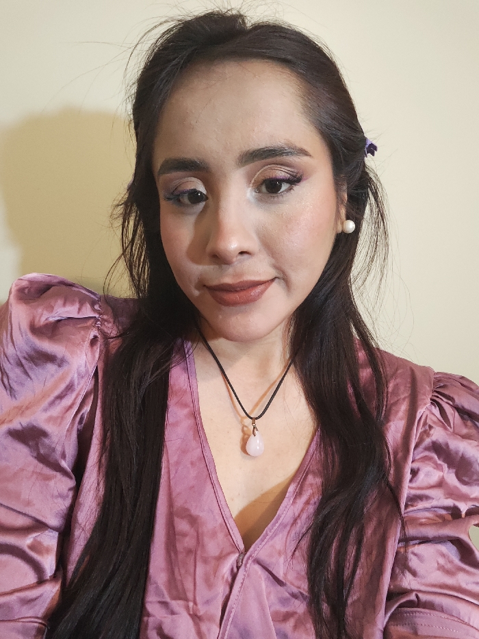 A person poses for a selfie, showcasing elegant makeup with purple eyeshadow and blush. They wear a silk mauve blouse with puffed sleeves, complemented by a pearl earring and a rose quartz pendant on a black cord. Their dark hair is styled long, with a small purple flower tucked behind their ear. The background is a plain off-white wall.