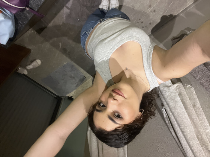 A woman takes a selfie from a high angle, looking up at the camera. She's wearing a gray tank top and jeans, with white sneakers visible in the background. She has curly brown hair and wears a silver necklace. The background appears to be an indoor space with a staircase and some furniture. A curtain or draped fabric is on the right side of the frame.