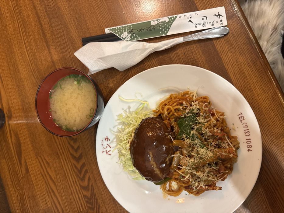 A white plate holds a Japanese meal consisting of a hamburger steak with dark gravy, spaghetti, and shredded cabbage. A bowl of miso soup sits to the left of the plate. A pair of chopsticks and a napkin lie above the plate. The food is on a wooden table.