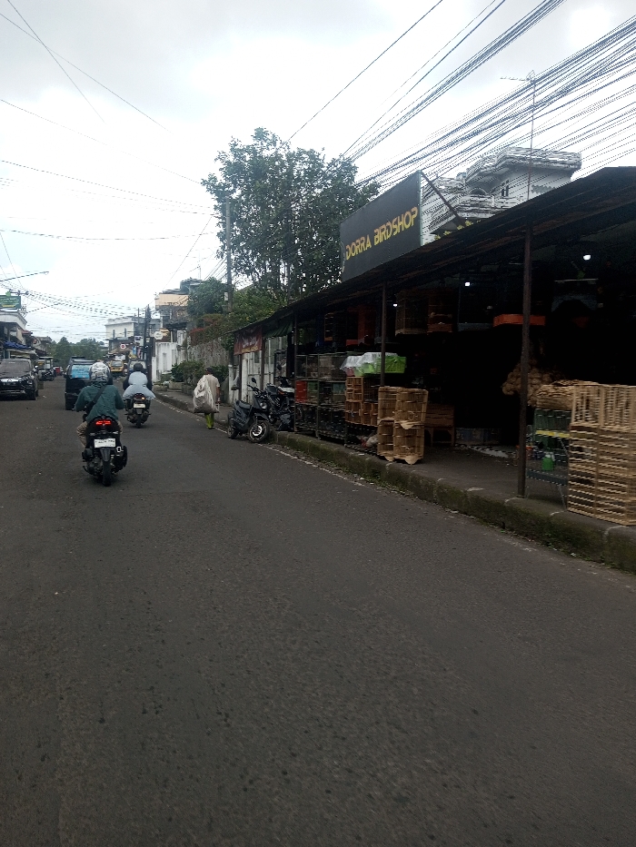 The image depicts a street scene in Kalchini, India, under an overcast sky. The asphalt road occupies the center and left foreground. Three motorcycles are visible on the road, traveling away from the viewer. The closest motorcyclist wears a green jacket and helmet, operating a dark-colored scooter. The second motorcyclist wears a light-colored garment and helmet. A third motorcycle is further in the distance. A black SUV and a dark-colored van are also visible on the left side of the road, behind the motorcycles. On the right side of the image, a raised concrete sidewalk runs parallel to the road. A commercial establishment named "DORRA BIRDSHOP" is prominent, featuring a black sign with white lettering. The shop has a dark corrugated roof supported by vertical posts, creating a covered outdoor display area. Numerous bird cages, varying in size and material (some wooden, some wire), are stacked and displayed on the sidewalk and within the shop's open front. Wooden crates are also visible. One motorcycle is parked on the sidewalk in front of the birdshop. A pedestrian, carrying a large, light-colored sack over their shoulder, walks on the sidewalk away from the viewer. Beyond the birdshop, a multi-story white building with ornate architectural details is partially visible. Further down the street, additional buildings line both sides, and lush green foliage from trees is discernible in the mid-ground. A dense network of overhead utility wires stretches across the sky, connecting to utility poles visible on both sides of the street.