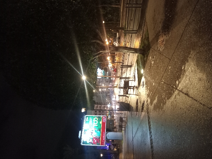 A nighttime street scene shows a wet sidewalk illuminated by streetlights, leading to benches under bare trees. In the distance, blurred lights from buildings and moving traffic create a glow. A large, brightly lit advertisement panel stands to the side, featuring green and red colors with a prominent "6" visible. The left side of the image is dark, filled with foliage.