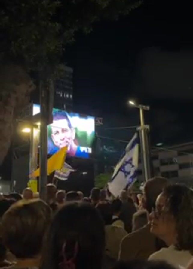 At night, a crowd is gathered in a public space, facing a large screen displaying a video of a man. Israeli flags are visible among the crowd. The scene is illuminated by streetlights and the glow of the screen. The people are watching the video intently.