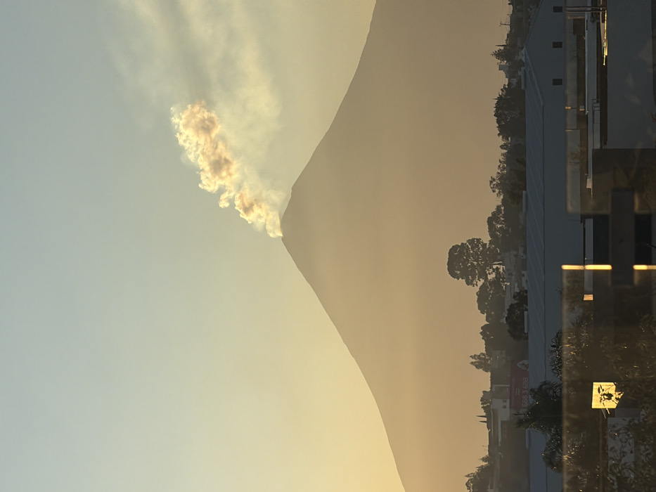 A volcano, framed by a clear sky, emanates a plume of smoke. The landscape transitions from a soft blue sky to warm golden hues as the sun sets. The scene incorporates glimpses of a building, possibly viewed through a window, adding an urban contrast to the natural spectacle. The lighting paints a hazy ambiance, enhancing the depth and complexity of the composition.