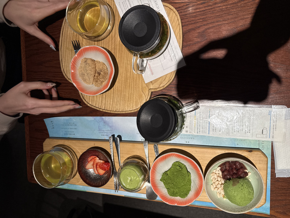 A close-up, overhead shot displays a table setting in a cafe located in Shibuya, Japan, featuring a Japanese tea and dessert assortment