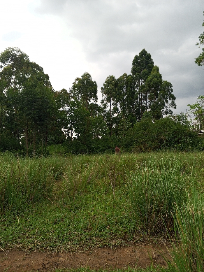 The scene depicts a rural outdoor environment in Borabu Chitago ward, Kenya, under an overcast, grey sky. In the foreground, a strip of disturbed brown earth or dirt path runs horizontally across the bottom, transitioning into a large expanse of tall, unkempt green grass and sparse green foliage. A faint path or cleared area is visible through the tall grass in the mid-left. One individual is present in the mid-to-background, positioned slightly to the right of center. This person appears to be an adult male, viewed from behind, with dark skin, wearing dark lower garments (likely shorts or trousers), and appearing shirtless or wearing a top that blends with his skin tone. He is partially obscured by the tall grass and is either standing still or moving away from the viewer, facing towards a dense treeline. The background consists of a thick stand of tall, slender trees with dark green foliage, possibly eucalyptus, extending across the horizon, with additional layers of shorter, bushy green trees and shrubs in front of them. No other people, significant objects, or direct interactions are visible.