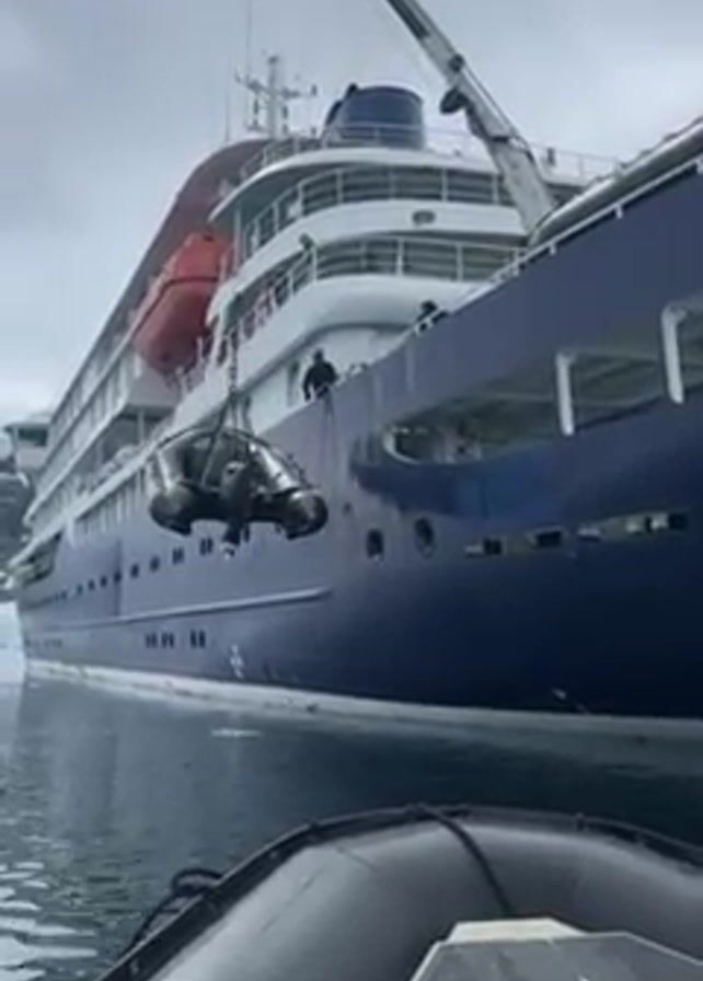 dark blue cruise ship in the water with a crane hoisting a black inflatable boat, marked with "124 OEX124" in white, toward the ship. A person stands on the side of the ship, seemingly guiding the boat. The scene is set on a cloudy day.