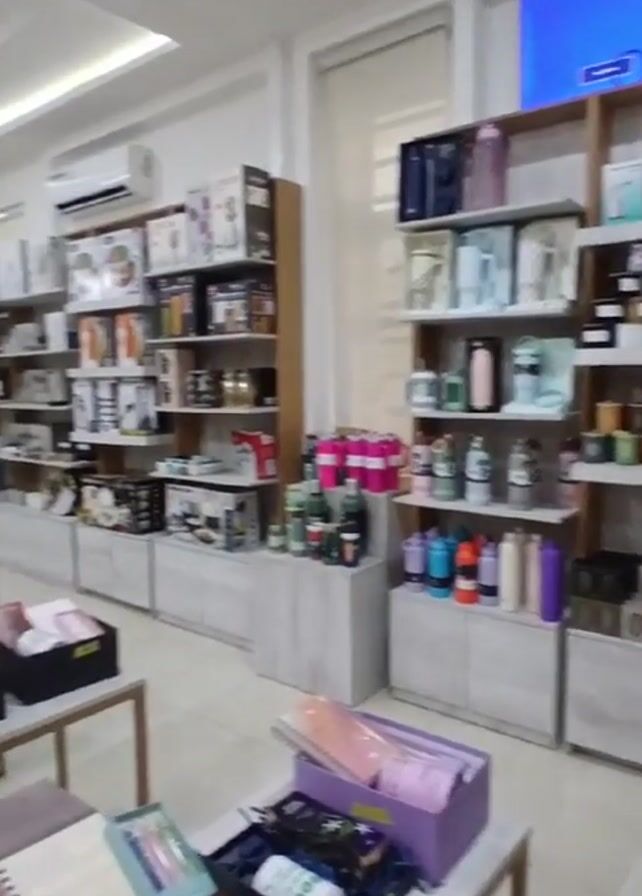 brightly lit, well-organized retail store. The interior is clean and the walls are painted white. Shelves and display tables showcase a variety of items, including kitchen appliances, water bottles, mugs, and gift sets. The gift sets are arranged in black boxes on tables. A television is mounted on the wall in the back of the store. There are no people visible in the video. The camera slowly pans across the store.
