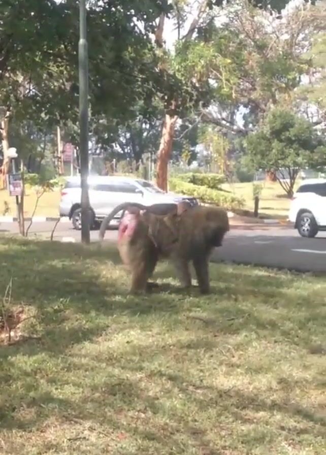 A medium shot shows a baboon carrying a baby baboon on its back, walking across a grassy lawn. The baboon is light brown and has a visible red rear. The baby baboon is smaller and blends in with the adult’s fur. Behind the baboon are parked white SUVs along a paved road. The background includes trees, a lamppost, and other vegetation. The scene appears to be in a park or landscaped area. The lighting is bright and sunny.
