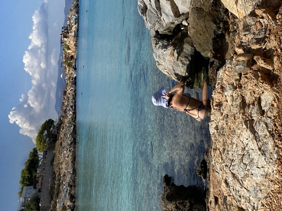 The image depicts a coastal scene in Megalochori, Greece, on a clear, sunny day. In the foreground, a woman is seated in shallow, transparent turquoise water, facing away from the viewer. She is wearing a dark blue string bikini and a light blue and white striped bucket hat, with her right hand near the side of her hat. She is positioned close to a large, grey rock formation on the right. The immediate ground consists of reddish-brown rocky terrain. Beyond the woman, the expansive body of water is exceptionally clear, revealing the rocky seabed and several distant individuals swimming. The background features a rocky coastline. To the left, a hillside is sparsely vegetated with green trees and shrubs, topped by white buildings. To the right, a distant peninsula displays beach umbrellas, sun loungers, and structures, suggesting a resort area, with a white boat moored nearby. The sky above is blue with scattered white cumulus clouds.