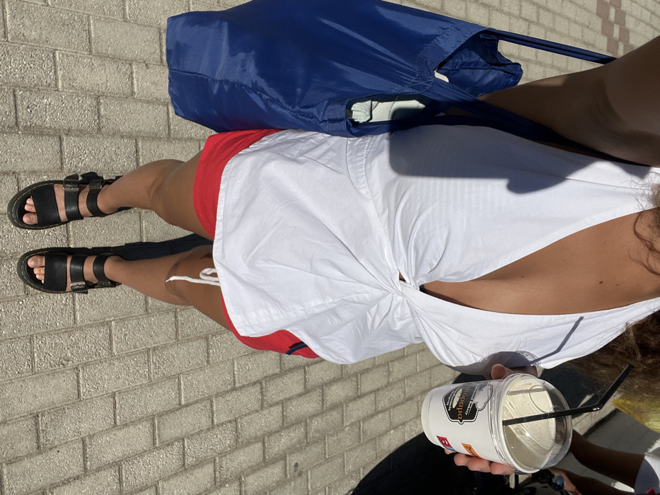 The image captures a first-person perspective of an individual standing outdoors on a paved surface in Skala, Greece. The subject is wearing a white V-neck halter top with a knotted detail at the waist, red shorts, and black multi-strap sandals. A blue fabric tote bag is visible on the subject's left side. The right hand holds a white paper cup with a clear dome lid and a black straw, featuring a logo that reads "Traditional Bakery" and "Παραδοσιακός Φούρνος." The ground consists of light grey rectangular interlocking pavers. Strong sunlight is present, indicated by distinct shadows cast on the subject and the ground.