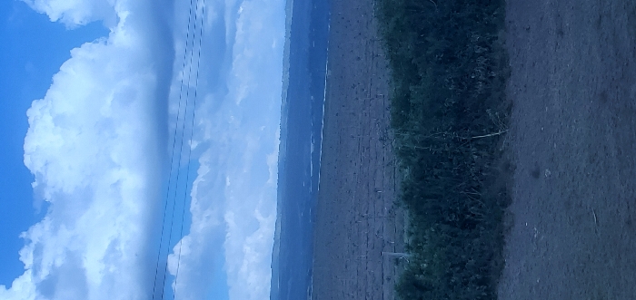 The image displays an expansive outdoor landscape under a cloudy sky, identified as being located in Viwandani ward, Kenya. The top portion of the frame is dominated by a pale blue sky featuring numerous large, white cumulus clouds, with darker grey clouds visible near the horizon. Three parallel, dark-colored power lines traverse horizontally across the upper sky section. Below the sky, a distant, hazy landscape unfolds. An undulating, dark blue horizon line marks the furthest visible land. Beneath this, a lighter blue-grey band suggests a distant valley or water body. The central part of the image is occupied by a vast, dark grey-brown field, appearing tilled or sparsely vegetated, with faint horizontal patterns possibly indicative of rows. Several thin, dark vertical elements, consistent with fence posts or small plants, are sparsely distributed across this field. The immediate foreground consists of a dark, uneven dirt surface. Directly behind this ground, a dense, horizontal strip of dark green, bushy vegetation is visible, from which a few slender, lighter-colored plant stems protrude upwards. No human or animal subjects are present within the scene.