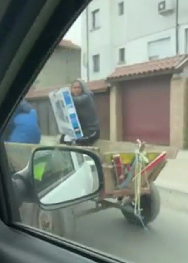 The video, shot from inside a moving car, shows a horse-drawn cart carrying people and a large, boxed television