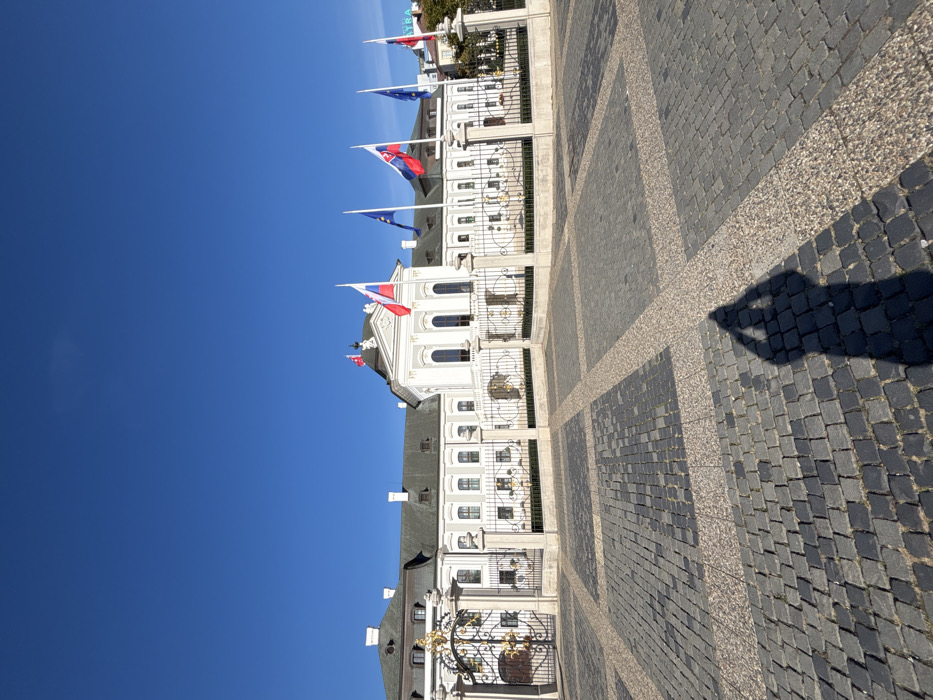 The image displays the Grassalkovich Palace, also known as the Presidential Palace, located at Hodžovo námestie in Bratislava, Slovakia. The prominent white, multi-story neoclassical building features a dark, sloped roof and numerous rectangular windows. A decorative black metal fence with gold ornamental elements spans the palace frontage, including large, ornate gates positioned on the left side. On the palace's central rooftop, two flags are visible: one red and white, and one Slovak national flag. Five flagpoles in front of the palace display an alternating sequence of Slovak national flags and European Union flags. The foreground is a large paved area comprising dark grey cobblestones arranged in rectangular sections, separated by lighter-colored stone strips. A distinct human shadow, indicative of a person holding a camera or phone, is cast upon the lower right section of the paved area. The sky is clear and bright blue, suggesting strong daylight conditions. A fragment of another building with a visible green sign ("ASTRA") is present in the distant background to the right.