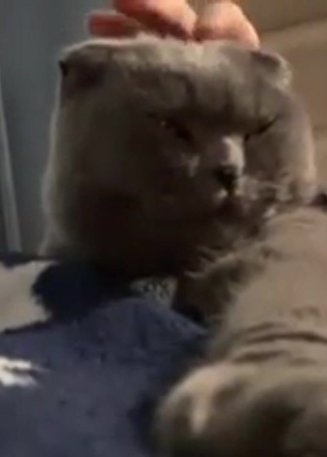 A gray Scottish Fold cat is lying on a dark blue blanket with white stars. A person is stroking the cat's head. The cat's eyes are closed, and it appears relaxed. The person is wearing a light green shirt. The background is blurry but appears to be a room with a window.